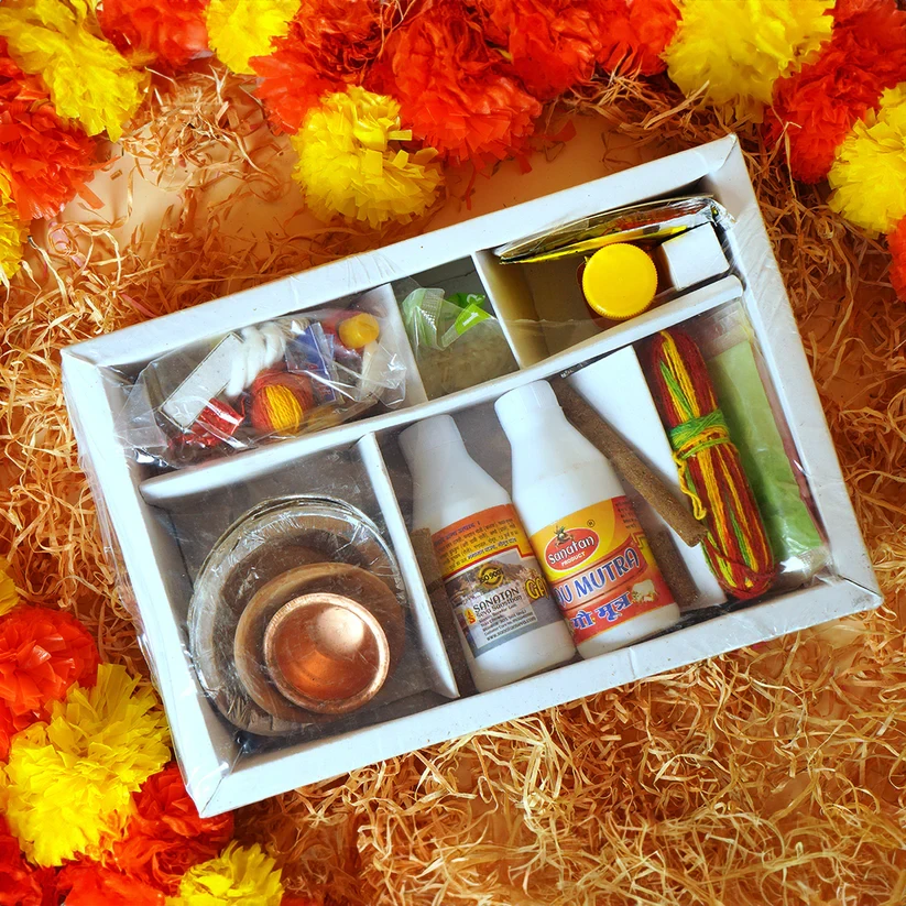 भूमि/नींव पूजा सामग्री किट – कुमकुम, तांबे का कलश, नाग-नागिन, गंगाजल, गौमूत्र, अमरबेल, कच्चमच, चावल, सिन्दूर, मालीपन्ना, मौली, सुपारी, अगरबत्ती, कपूर, मिश्री, गुलाल, अबीर, रुई की बत्ती, माचिस, दूना, घी का दीपक।