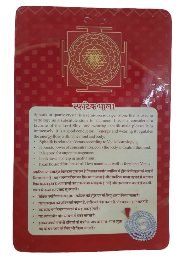 This mala is ideal for meditation, mantra chanting (japa), and spiritual healing. It helps in enhancing concentration, calming the mind, and promoting inner peace and harmony. Wearing or using a Sphatik mala also helps cool the body and attract spiritual energy. The mala comes lab-certified for authenticity, ensuring you receive 100% genuine and natural crystal quartz beads.