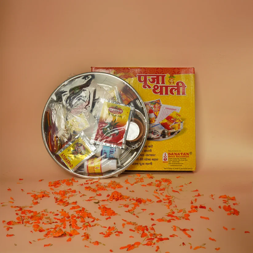 Ganga jal, gau mitr, Honey, itr, moli, rudraksh, supari, kamal gaata, kodi, dhoop bari, kapoor, sarso, dhaniya, moong, Abeer, gulaal, Kumkum chawal, Ruhi bati, Deepak, agarbatti stand, ghee ka deepak, Laxmi photo aarti, steel thali