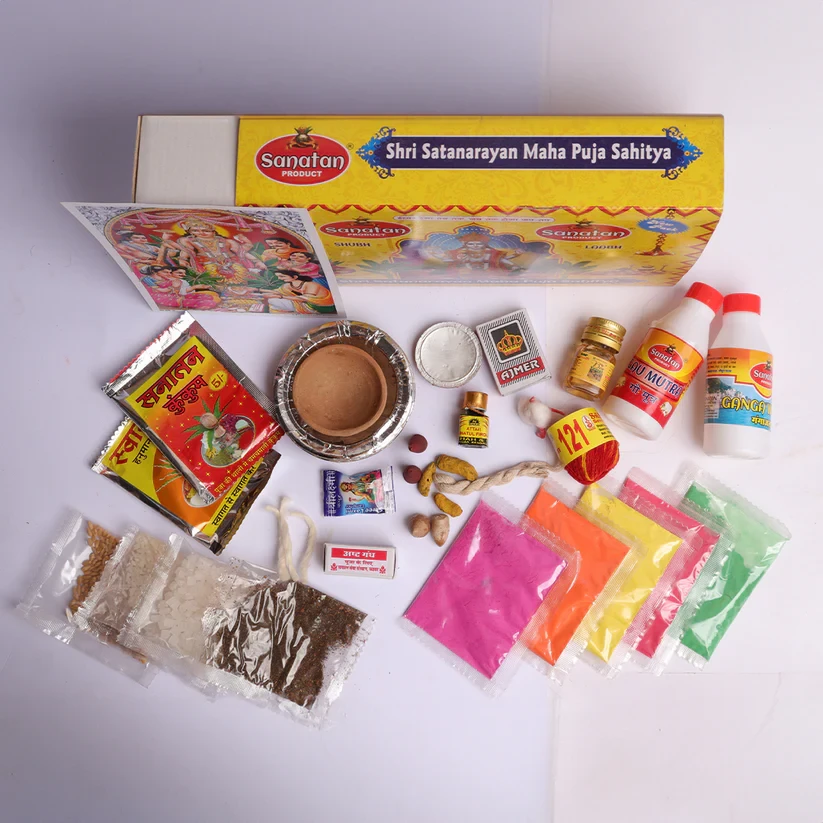 हल्दी, चंदन पाउडर, दूना, कुमकुम, पूजा मध, गेहूं, चावल, रुई की बत्तियाँ, मिश्री, गुलाल, समई की बत्ती, चौरंग, अखरोट (अखिल), जनेऊ जोड़ा, घी का दीपक, मौली (कलावा), सुपारी, श्री सत्यनारायण जी की तस्वीर, सिन्दूर, अगरबत्ती, आरती, अष्टगंध, गंगाजल, माचिस, कपूर, गौमूत्र, इत्र, प्रसाद, अगरबत्ती स्टैंड, मिट्टी के दीये।