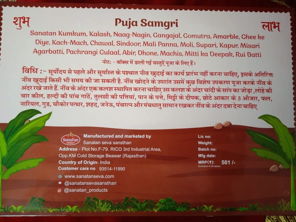 भूमि/नींव पूजा सामग्री किट – कुमकुम, तांबे का कलश, नाग-नागिन, गंगाजल, गौमूत्र, अमरबेल, कच्चमच, चावल, सिन्दूर, मालीपन्ना, मौली, सुपारी, अगरबत्ती, कपूर, मिश्री, गुलाल, अबीर, रुई की बत्ती, माचिस, दूना, घी का दीपक।