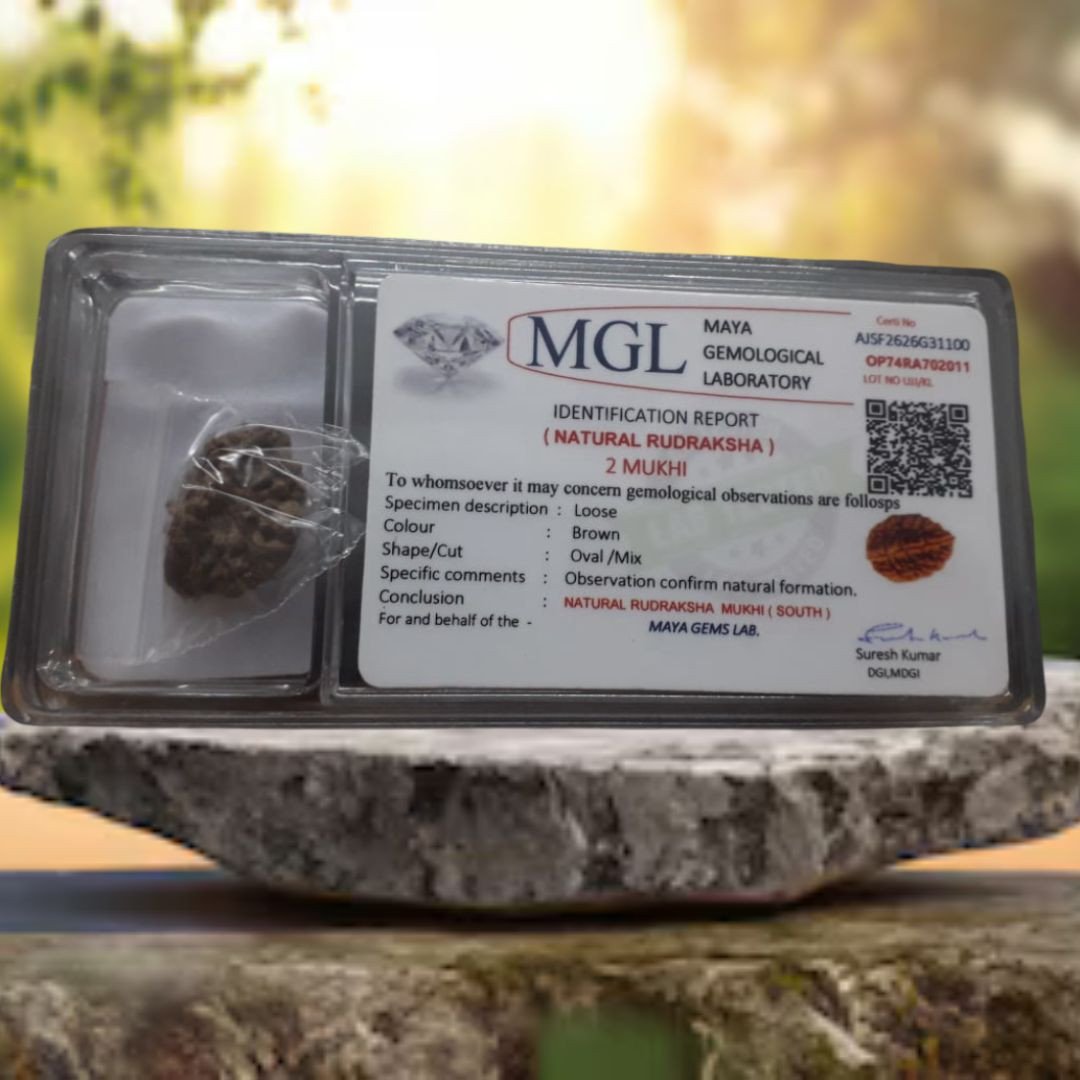 The Certified 2 Mukhi Rudraksha (Two-Face Rudraksha) is a sacred and powerful bead that symbolizes the divine union of Lord Shiva and Goddess Parvati. It represents harmony, love, and balance — making it ideal for those seeking peace in relationships and emotional stability. This Rudraksha is also associated with the Moon (Chandra) planet and is used as a remedy for Moon-related doshas in astrology.