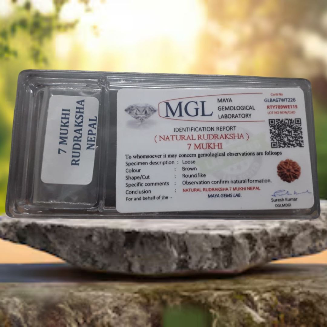 The Certified 7 Mukhi Rudraksha (Seven-Face Rudraksha) is a sacred and powerful bead that represents Goddess Mahalakshmi, the goddess of wealth, prosperity, and abundance. It is associated with the planet Saturn (Shani) and is used as a remedy for Saturn-related doshas, such as financial struggles, obstacles, delays, and misfortune.