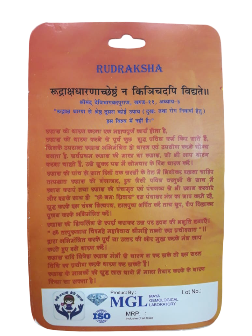 This mala is perfect for meditation, mantra chanting (japa), and daily spiritual wear. It helps in enhancing focus, reducing stress, and bringing peace, positivity, and protection to the wearer. The natural Rudraksha beads balance mind, body, and soul, promoting spiritual growth and emotional stability. The mala comes lab-certified for authenticity, ensuring you receive 100% genuine and natural Rudraksha beads.