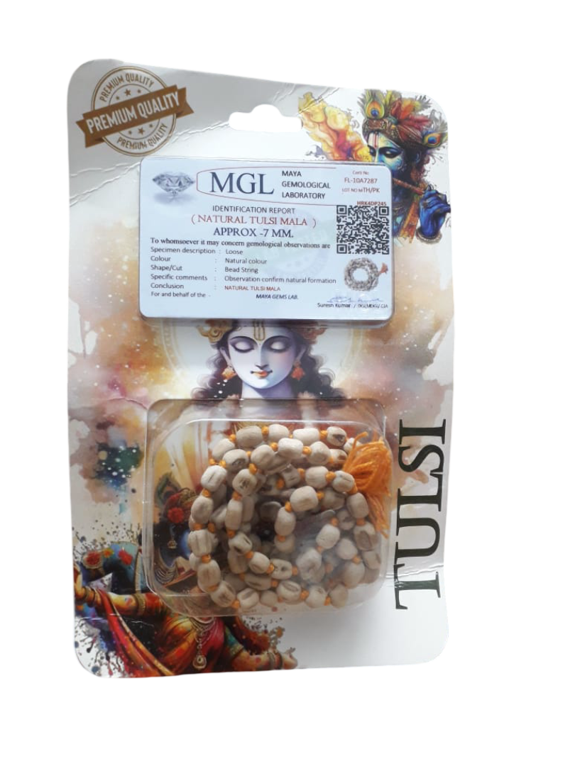 This Tulsi Mala is ideal for chanting mantras, meditation, and spiritual practices. It helps in calming the mind, enhancing focus, and connecting with divine energy. Wearing or using the Tulsi Japa Mala is also said to attract positive vibrations and remove negative influences. The mala comes certified for authenticity, ensuring you receive 100% natural Tulsi beads.