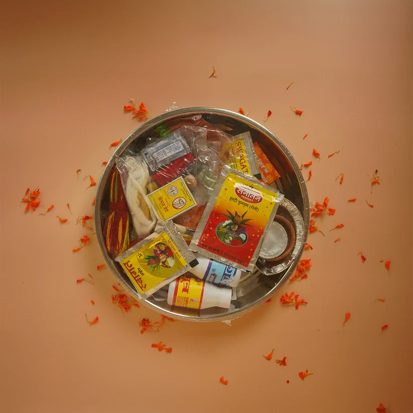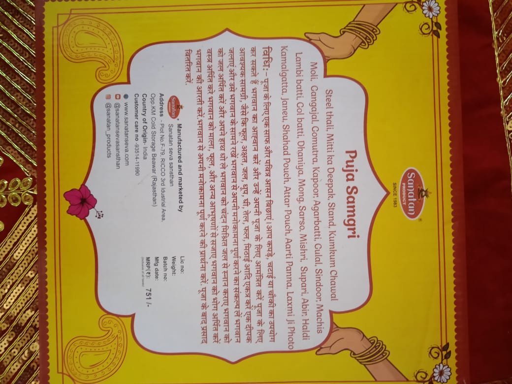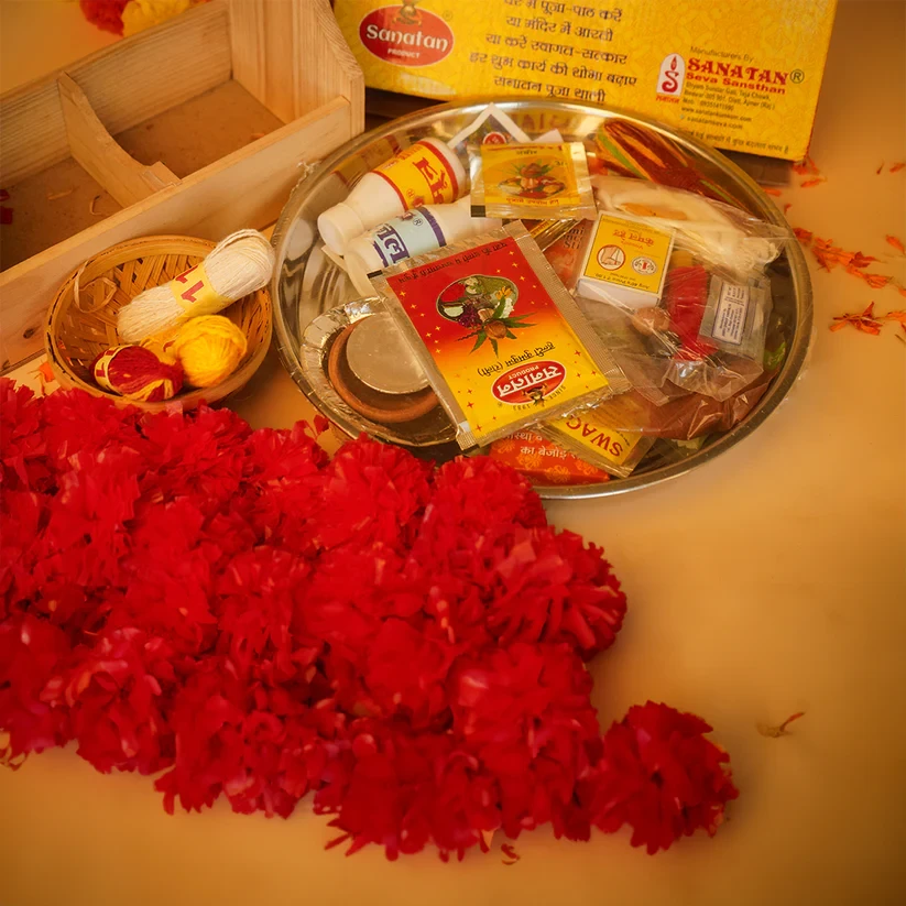 Ganga jal, gau mitr, Honey, itr, moli, rudraksh, supari, kamal gaata, kodi, dhoop bari, kapoor, sarso, dhaniya, moong, Abeer, gulaal, Kumkum chawal, Ruhi bati, Deepak, agarbatti stand, ghee ka deepak, Laxmi photo aarti, steel thali