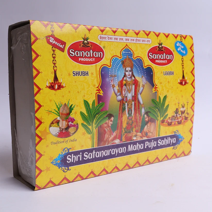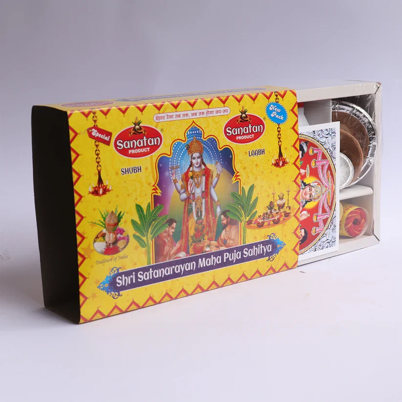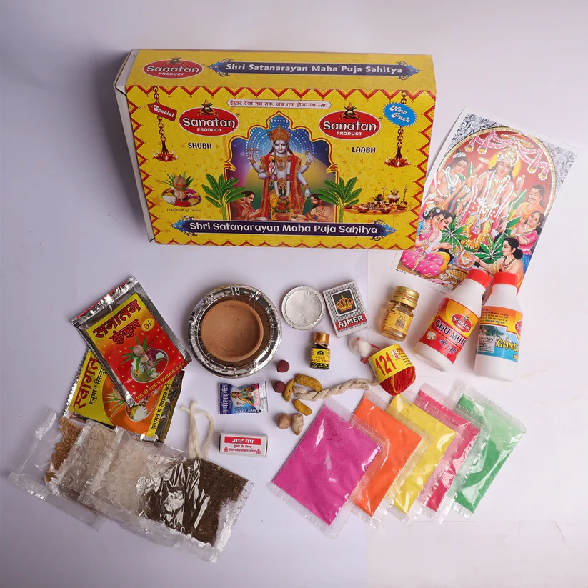 हल्दी, चंदन पाउडर, दूना, कुमकुम, पूजा मध, गेहूं, चावल, रुई की बत्तियाँ, मिश्री, गुलाल, समई की बत्ती, चौरंग, अखरोट (अखिल), जनेऊ जोड़ा, घी का दीपक, मौली (कलावा), सुपारी, श्री सत्यनारायण जी की तस्वीर, सिन्दूर, अगरबत्ती, आरती, अष्टगंध, गंगाजल, माचिस, कपूर, गौमूत्र, इत्र, प्रसाद, अगरबत्ती स्टैंड, मिट्टी के दीये।
